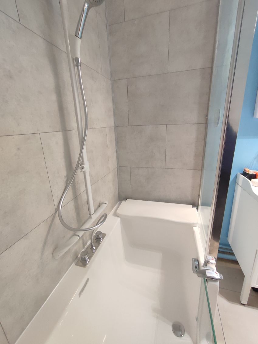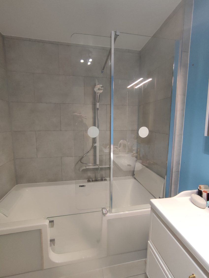 Alors exit la cabine de douche obsolète, un compromis a été trouvé avec l’installation de ce combiné Baignoire à porte / Douche sécurisée proposé par Optidomia.